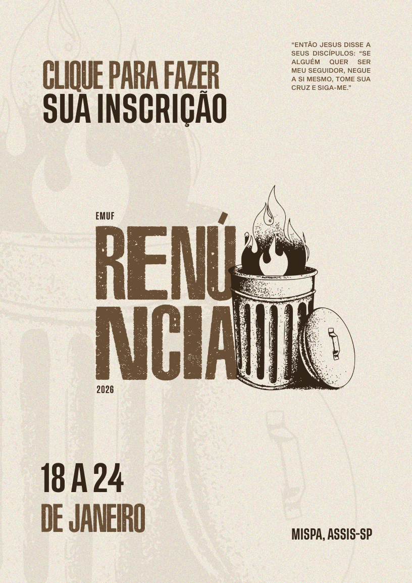 Faça parte do EMUF e viva uma experiência missionária inesquecível! Este evento é uma oportunidade única para adolescentes, jovens e líderes mergulharem no universo das missões por meio de ensinamentos práticos, vivências em campo e atividades impactantes. Junte-se a nós e seja parte de uma geração que transforma vidas e compartilha o amor de Deus onde estiver!